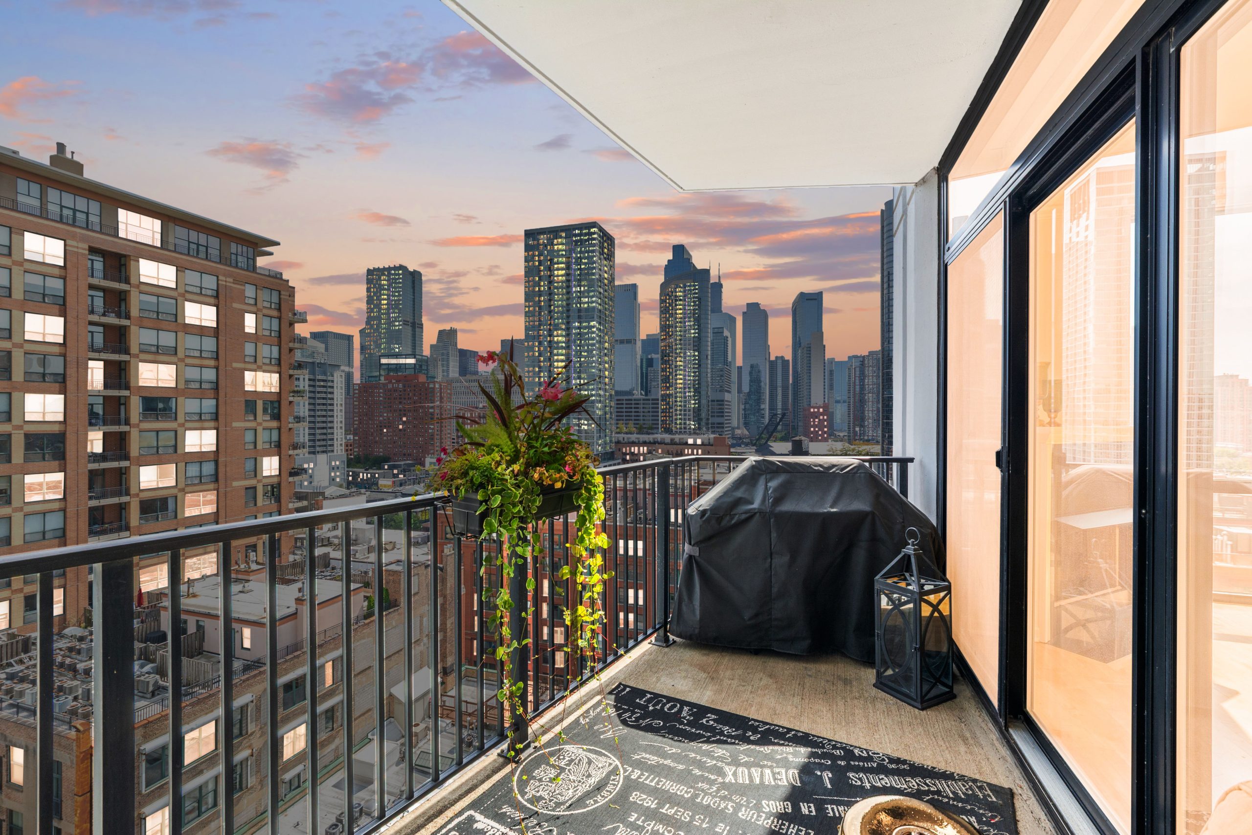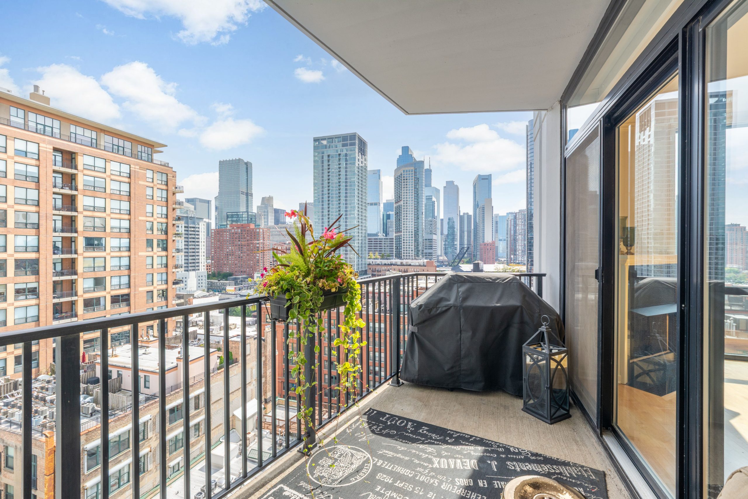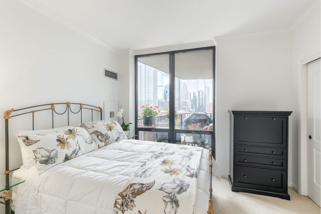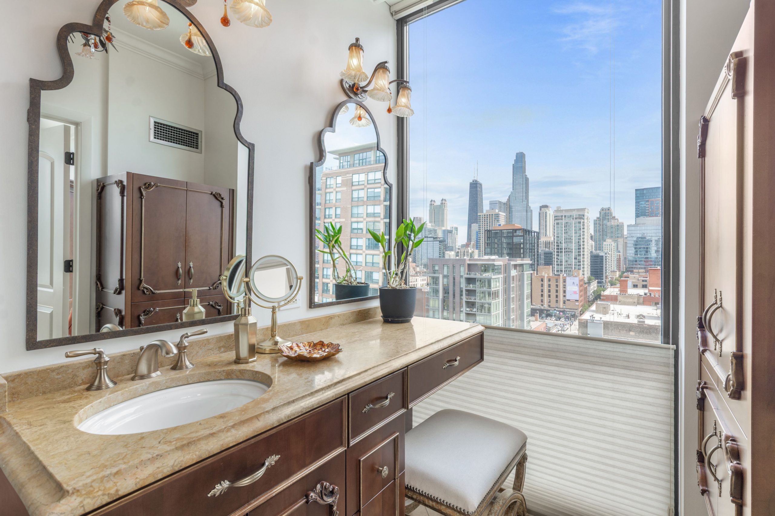 Enjoy stunning panoramic city views from floor-to-ceiling windows in the coveted southeast tier at Erie Center. Price includes a deeded 2-car tandem prime parking spot in the attached, heated garage! This spacious home with a desirable floor plan is flooded with natural light. The open concept living/dining room features hardwood floors, a gas fireplace, and incredible views. The updated kitchen features quartz countertops, a large island, abundant storage, and newer stainless steel appliances. The large, primary bedroom features a walk-in closet with custom wood shelving and a stunning custom marble and travertine ensuite with a soaking bubble tub and glass door steam shower. A generously sized second bedroom with a custom-organized closet and updated bath with a walk-in shower. The hallway features spacious closets with custom wood shelving. An in-unit stackable washer/dryer and a building storage locker are also included. Erie Center features a stylish lobby, 24/7 door staff/security, an on-site property manager and maintenance staff, fitness center, rooftop sundeck, party room, and bike room. The prime River North location is near public transportation, coffee shops, Montgomery Park (dog-friendly), the East Bank Club, and world-class dining. A beautiful home with gorgeous views…this must be your place!